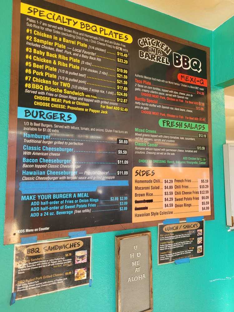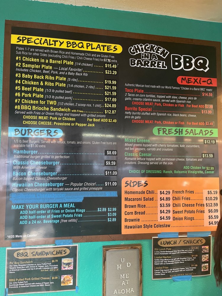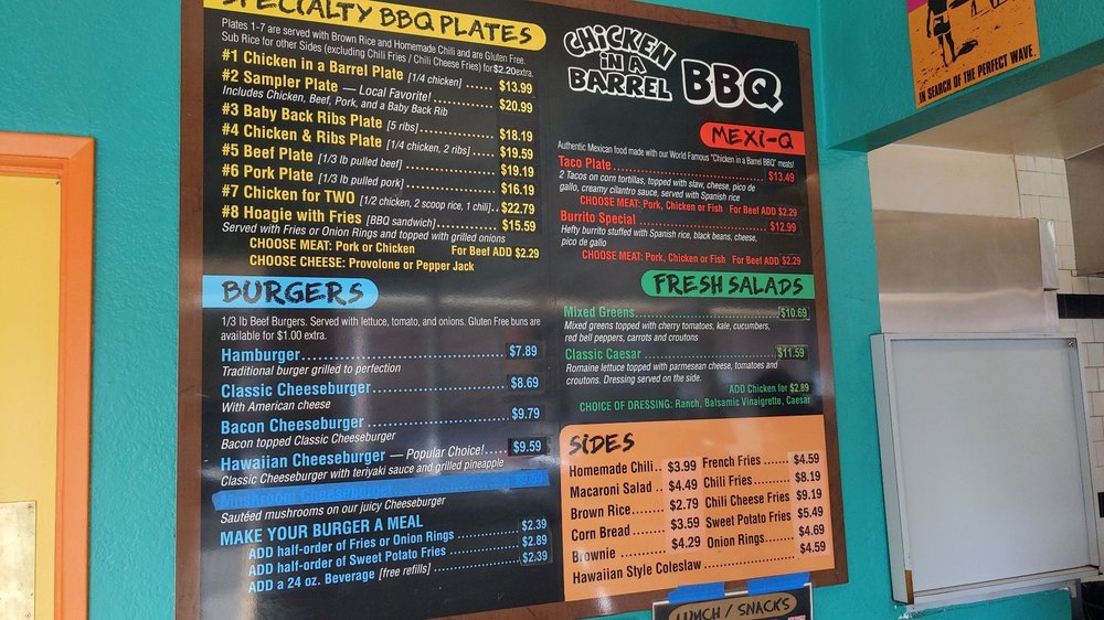 Welcome to Chicken In A Barrel BBQ- South Lake Tahoe, where tantalizing flavors meet a laid-back atmosphere. This Hawaiian-inspired eatery specializes in mouthwatering burgers and BBQ, ensuring a delightful experience for every palate. The menu offers a robust selection featuring tender, smoked meats infused with island flavors, paired with many vegetarian options to satisfy all diners.